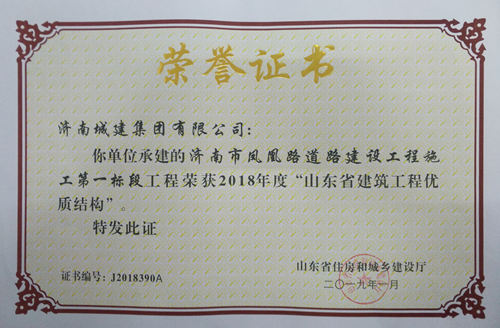 济南市凤凰路道路建设工程施工第一标段工被评为2018年度“山东省建筑工程优质结构”