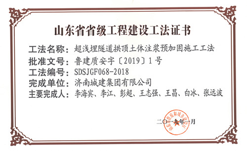 南宫体育 “超浅埋隧道拱顶土体注浆预加固施工工法”被评为山东省省级工程建设工法