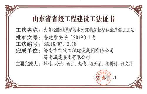 南宫体育 “大直径圆形薄壁污水处理构筑物整体浇筑施工工法”被评为山东省省级工程建设工法