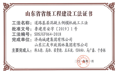 南宫体育 “道路基层混凝土侧模机施工工法”被评为山东省省级工程建设工法