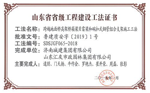 南宫体育 “跨越地面桥高架桥箱梁贝雷梁和碗扣式钢管组合支架施工工法”被评为山东省省级工程建设工法