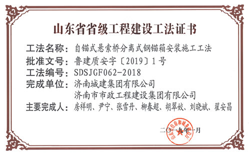 南宫体育 “自锚式悬索桥分离式钢锚箱安装施工工法”被评为山东省省级工程建设工法