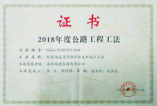 南宫体育 “暗挖隧道薄壁钢管砼支护施工工法”被评为2018年度公路工程工法