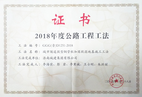 南宫体育 “城市隧道微型钢管桩加固软弱地基施工工法”被评为2018年度公路工程工法