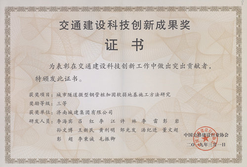 南宫体育 《城市隧道微型钢管桩加固软弱地基施工方法研究》荣获“交通建设科技创新成果奖三等奖”