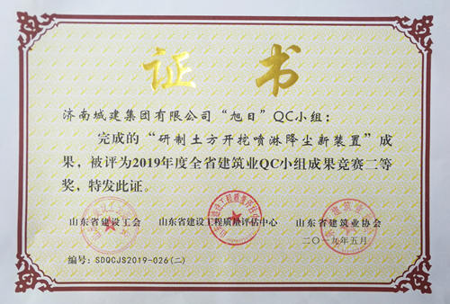 南宫体育 ”旭日“QC小组完成的《研制土方开挖喷漆降尘新装置》成果被评为“2019年度全省建筑业QC小组成果竞赛二等奖