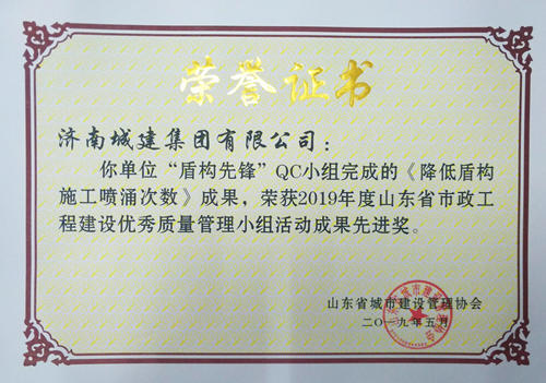 南宫体育 “盾构先锋”QC小组完成的《降低盾构施工喷涌次数》成果荣获“2019年度山东省市政工程建设优秀质量管理小组活动成果先进奖