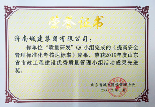 南宫体育 “质量研发”QC小组完成的《提高安全管理标准化考核达标率》成果荣获“2019年度山东省市政工程建设优秀质量管理小组活动成果先进奖